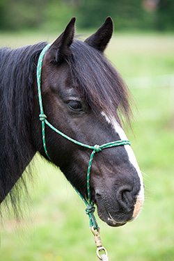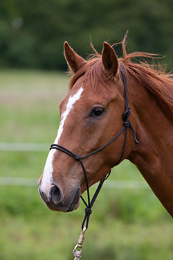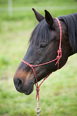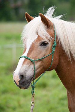 Das mag er nicht so: das stille Halfter, an das er muss, wenn er zu intensiv die Reitstunde aufgemischt hat;-)